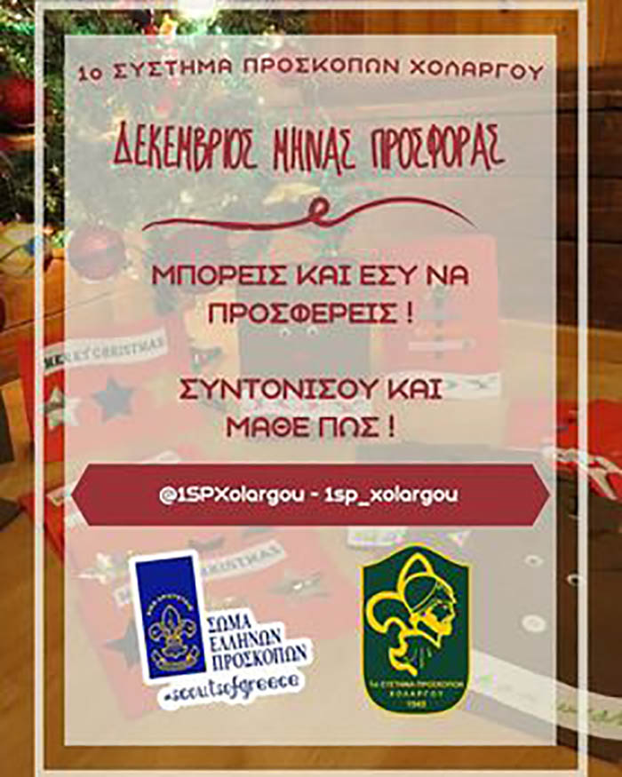 Για το μήνα που διανύουμε, το μήνα Δεκέμβριο της προσφοράς το 1ο Σύστημα Προσκόπων Χολαργού προγραμματίζει μία σειρά από κινήσεις και δράσεις σε αυτό το πλαίσιο της αγάπης και της αλληλεγγύης.