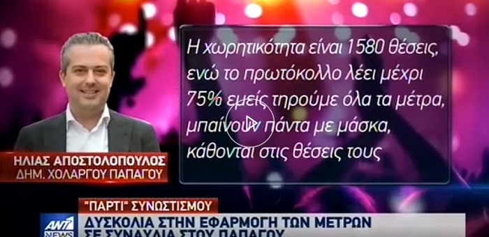 Ως "πάρτι" συνωστισμού χαρακτήρισε τη συναυλία που διοργάνωσε ο Δήμος Παπάγου Χολαργού το Σάββατο 1η Αυγούστου το ρεπορτάζ του κεντρικού δελτίου ειδήσεων του ΑΝΤ1 της Τρίτης 4 Αυγούστου.