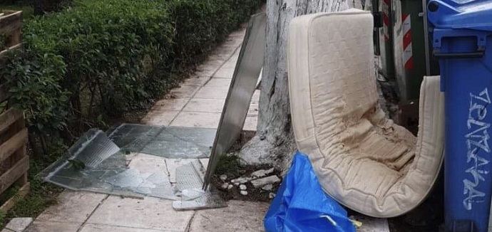 Η κατάσταση αυτή στους συγκεκριμένους κάδους μπροστά από τον πύργο της Αετιδέων είναι σταθερή και συνηθισμένηα πια. Τα σπασμένα τζάμια όμως αυτή