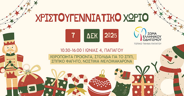 Με τον καλύτερο τρόπο "ανοίγει" την εορταστική περίοδο το Τοπικό Τμήμα Οδηγών Παπάγου με την πρόσκληση για το φετινό Χριστουγεννιάτικο Χωριό, μια εορταστική εκδήλωση – θεσμό πια που με πολύ μεράκι και αγάπη για όλους εμάς διοργανώνουν κάθε χρόνο.
