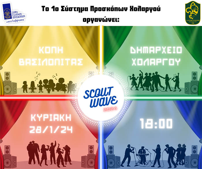Το 1ο Σύστημα Προσκόπων Χολαργού σας προσκαλεί στην φετινή εκδήλωση κοπής βασιλόπιτας με θέμα τα φετινά Scoutwave 2024 όπου λαμβάνουν μέρος χιλιάδες καλλιτέχνες στην Αίθουσα "Μίκης Θοδωράκης" στο Δημαρχείο Χολαργού, την Κυριακή 28 Ιανουαρίου και ώρα 18:00- 21:00. Ελάτε να γνωρίσετε τους διαγωνιζόμενους που θα μας δείξουν ότι προετοίμασαν όλη