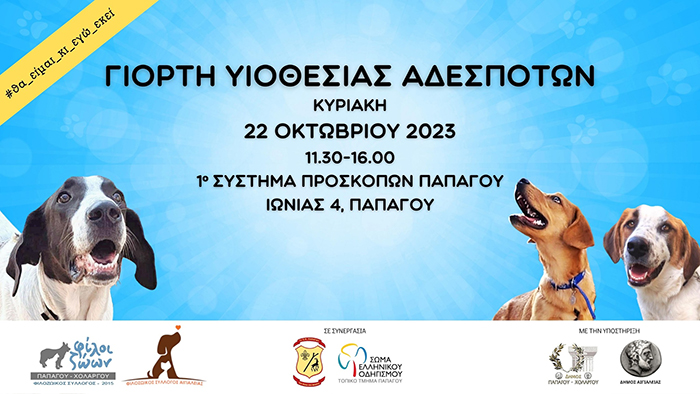 Σήμερα Κυριακή (22/10) από τις 11:30 έως τις 16:00 το 1ο Σύστημα Προσκόπων Παπάγου φιλοξενεί στη λέσχη του (Ιωνίας 4, Παπάγου) τη Γιορτή Υιοθεσίας Αδέσποτων, η οποία πραγματοποιείται από το σύλλογο "Φίλοι Ζώων Παπάγου-Χολαργού" και το Φιλοζωικό Σύλλογο Αιγιάλειας "Τα Φιλαράκια".