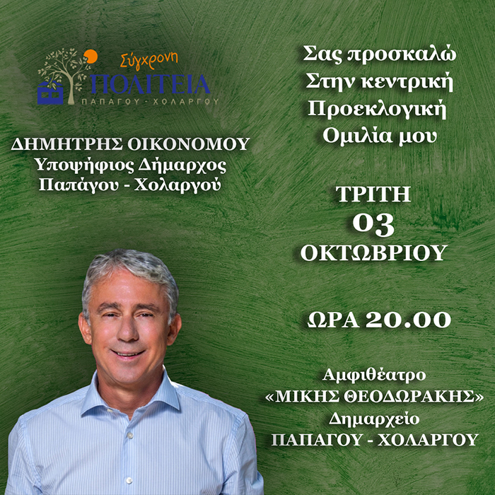 Σειρά σήμερα έχει η κεντρική προεκλογική ομιλία του Υποψηφίου Δημάρχου Παπάγου Χολαργού Δημήτρη Οικονόμου. Η ομιλία θα ξεκινήσει στις 8μμ και θα πραγματοποιηθεί στο Αμφιθέατρο Μίκης Θεοδωράκης του Δημαρχιακού Μεγάρου.