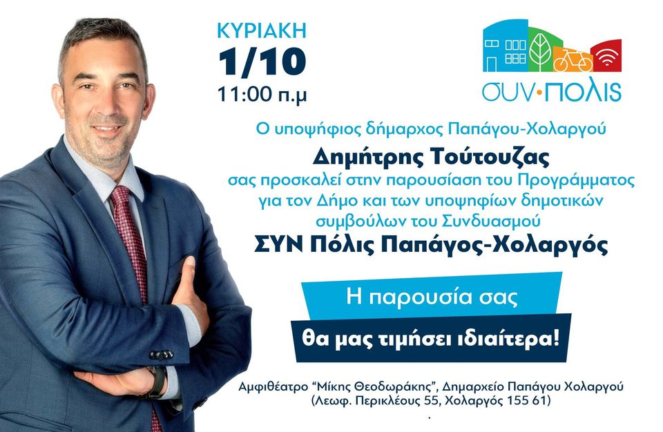 Σήμερα στις 11 στο Αμφιθέατρο «Μίκης Θεοδωράκης» (Δημαρχείο Παπάγου Χολαργού) ο Υποψήφιος Δήμαρχος Δημήτρης Τούτουζας παρουσιάζει το πρόγραμμά του και τον Συνδυασμό του.