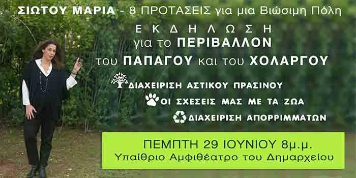 Η δημοτική παράταξη «8ΠΡΟΤΑΣΕΙΣ για μία Βιώσιμη Πόλη» προγραμματίζει εκδήλωση για το περιβάλλον της πόλης του Παπάγου - Χολαργού την προσεχή Πέμπτη 29 Ιουνίου 2023 στις 8μμ το βράδυ στο υπαίθριο θεατράκι του Δημαρχείου. Σε 4 άξονες θα αναπτυχθεί το θέμα διαχείριση αστικού πρασίνου, διαχείριση απορριμμάτων-ανακύκλωση, διαχείριση αδέσποτων, τοπικό μικροκλίμα.