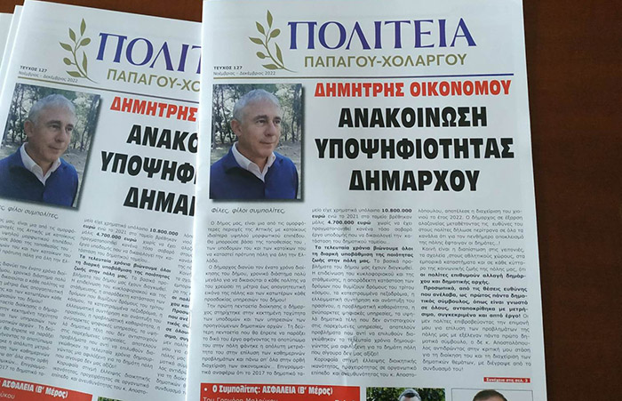 Στο πρώτο τεύχος για το 2023 της εφημερίδας «Πολιτεία Παπάγου Χολαργού» ανακοίνωσε ο Δημήτρης Οικονόμου την υποψηφιότητα του για τη θέση του Δημάρχου στις εκλογές του Οκτωβρίου. Στο συγκεκριμένο τεύχος, που μοιράζεται μαζικά αυτές τις μέρες στην πόλη, με μία αναλυτική τοποθέτηση του υποψηφίου πλέον Δημάρχου επιβεβαιώνει τις φήμες που