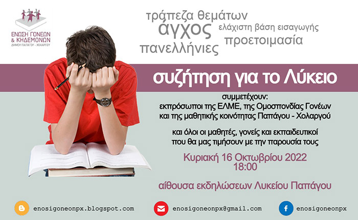 Η Ένωση Γονέων Παπάγου Χολαργού διοργανώνει εκδήλωση - συζήτηση για τις αλλαγές στο εξεταστικό σύστημα του Λυκείου (τράπεζα θεμάτων, ΕΒΕ) την Κυριακή, 16 Οκτωβρίου 2022 και ώρα 18:00 στην αίθουσα εκδηλώσεων του Λυκείου Παπάγου (είσοδος από Κύπρου).