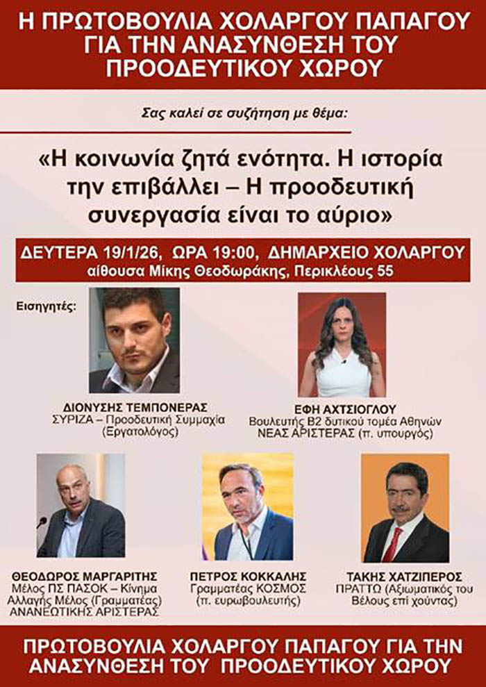 Σε μια περίοδο όπου η κοινωνία απαιτεί λύσεις, σταθερότητα και πραγματική δημοκρατική προοπτική, διοργανώνεται μια ανοιχτή πολιτική συζήτηση με θέμα τη σύγκλιση των προοδευτικών δυνάμεων και τη διαμόρφωση ενός κοινού πλαισίου συνεργασίας απέναντι στις μεγάλες προκλήσεις της χώρας.