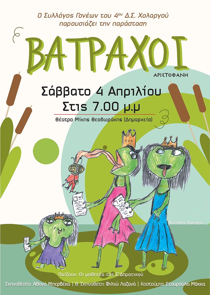 Το θεατρικό εργαστήρι του 4ου Δημοτικού Σχολείου Χολαργού, παρουσιάζει τη θεατρική παράσταση «Βάτραχοι» του Αριστοφάνης, υπό την καθοδήγηση της εκπαιδευτικού Αθηνάς Μπερδέκα.