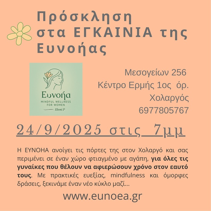 Την Τετάρτη 24 Σεπτεμβρίου 2025, στις 7:00 μ.μ., η ΕΥΝΟΗΑ ανοίγει τις πόρτες της στη Μεσογείων 256 (Κέντρο Ερμής, Χολαργός) και σας προσκαλεί σε μια βραδιά γνωριμίας και ζεστής υποδοχής.